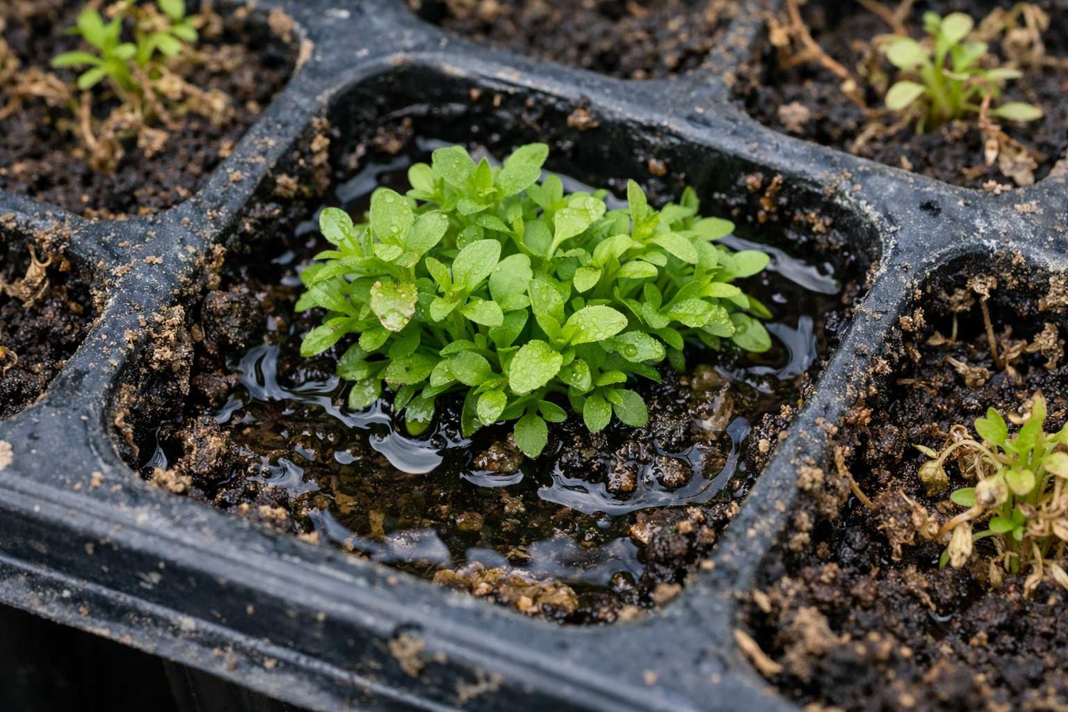 La coltivazione in cassetta è molto comoda, ma rappresenta una minaccia nascosta per le colture a seme piccolo. Il volume di terreno in una singola cella è minimo, e quindi disseccamento della zolla si verifica in poche ore. Il sole primaverile attraverso la finestra riscalda la plastica, l’umidità evapora rapidamente e le radici sottili subiscono danni critici.