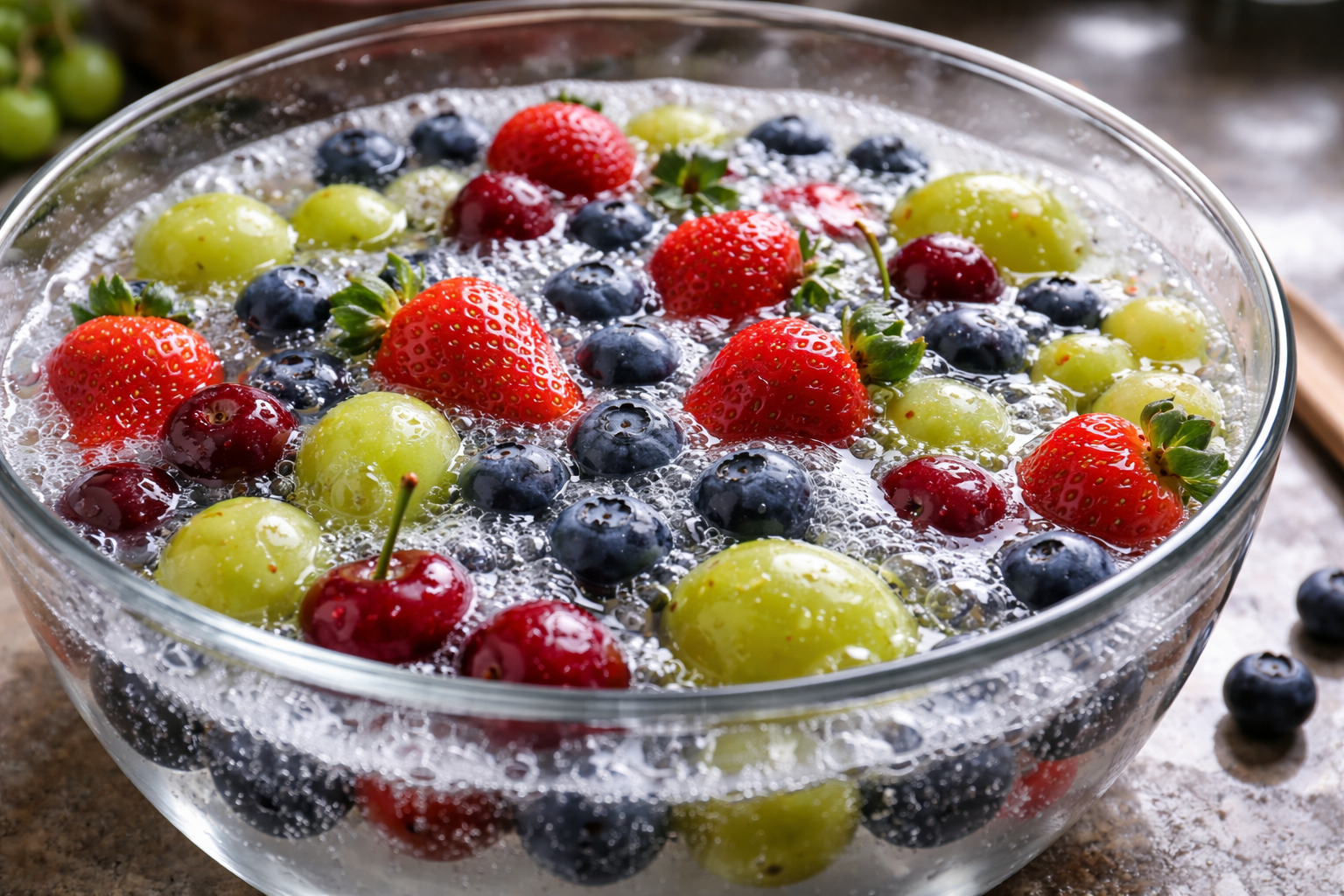 Il mio segreto: aggiungere sempre una goccia di succo di limone fresco all’acqua di ammollo dell’uva, per sciogliere immediatamente la placca appiccicosa. E per i frutti di bosco con struttura porosa utilizzare solo un bagno di ghiaccio, che manterrà la polpa perfettamente soda e ne impedirà l’inacidimento.