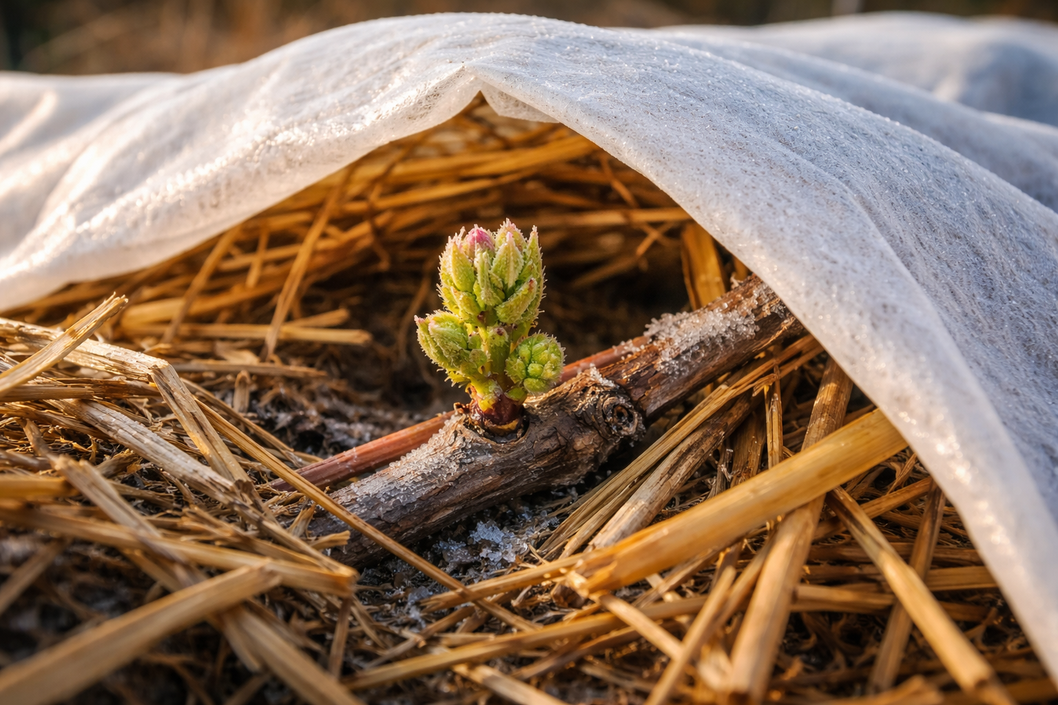 In primavera, una pacciamatura fitta è piuttosto dannosa per il processo, poiché impedisce al terreno di riscaldarsi durante il giorno e di fornire il calore salvifico ai cespugli durante la notte.
