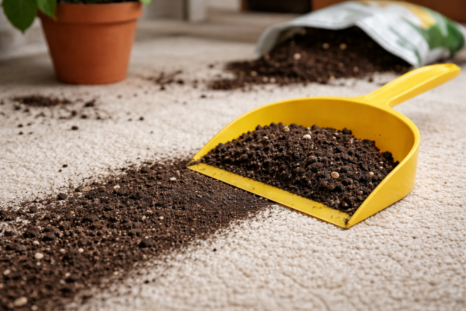 Il rinvaso di una pianta d’appartamento preferita spesso si risolve in una situazione spiacevole, quando il terriccio scuro ricopre un tappeto chiaro o un pavimento in laminato pulito. La mano si allunga automaticamente verso l’aspirapolvere o un panno umido, ma questi strumenti non fanno altro che spalmare lo sporco e spingere le particelle fini in profondità. Esiste un metodo incredibilmente semplice e sicuro che cambierà per sempre il vostro modo di affrontare la pulizia di questo sporco specifico.