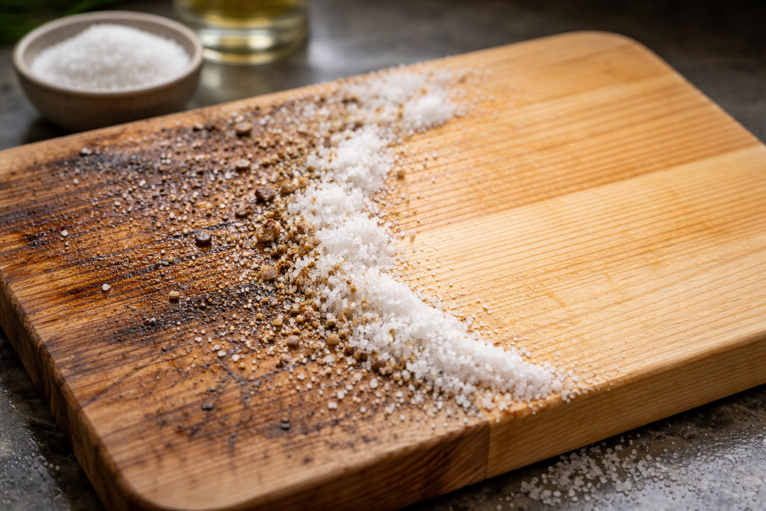 Il legno ha una struttura porosa. I detergenti standard lavano via solo il grasso superficiale, intrappolando i germi e i succhi degli alimenti in profondità nelle fibre. Per estrarre lo sporco è necessario assorbenti naturali e acidi alimentari.