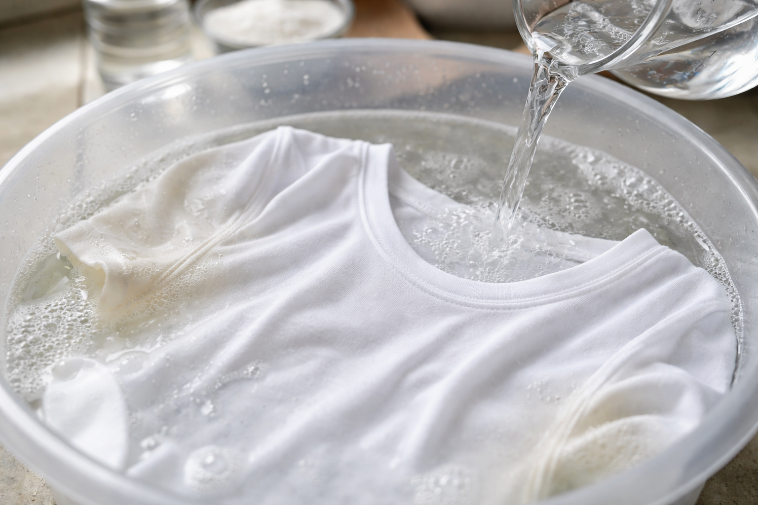 Se il tessuto è delicato e non volete usare acidi, l’acqua normale vi verrà in soccorso. bicarbonato di sodio. È eccellente nell’eliminare l’umidità e nell’assorbire le particelle di odore, agendo come un adsorbente.