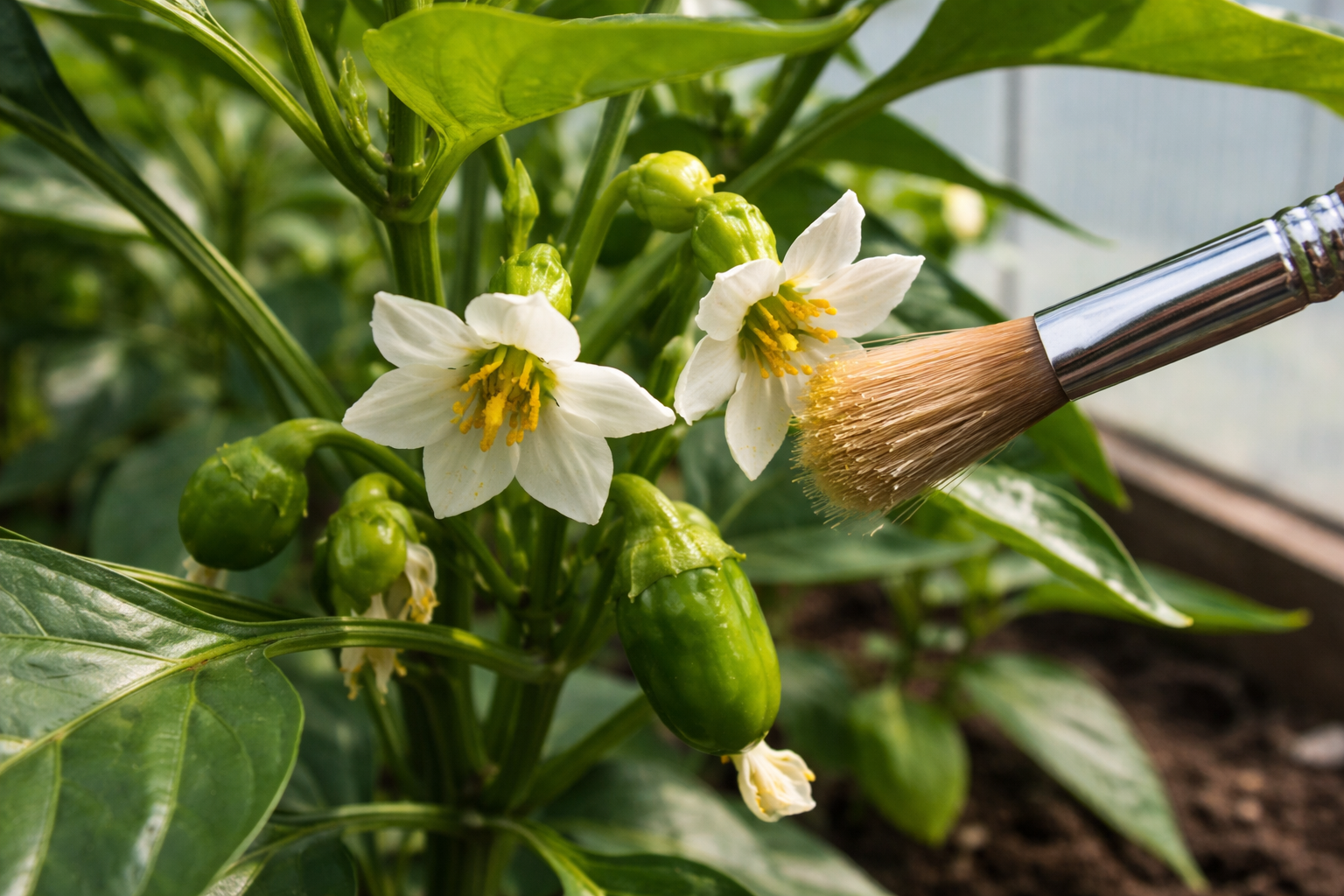Per garantire l’allegagione in una serra senza vento, scuotete delicatamente i cespugli ogni mattina per il fusto principale o batteteli leggermente su un traliccio teso.