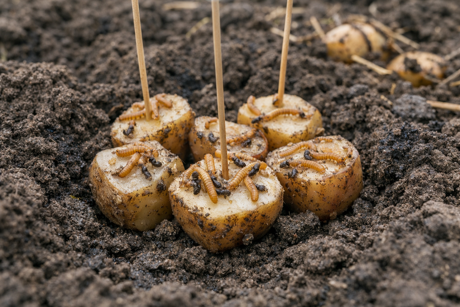 La strategia primaverile si basa sul distogliere gli insetti dai semi in germinazione e dai teneri tuberi. Le trappole specializzate sono ideali per questo scopo. In autunno, l’attenzione si sposta sulla modifica della struttura e della composizione chimica del terreno.