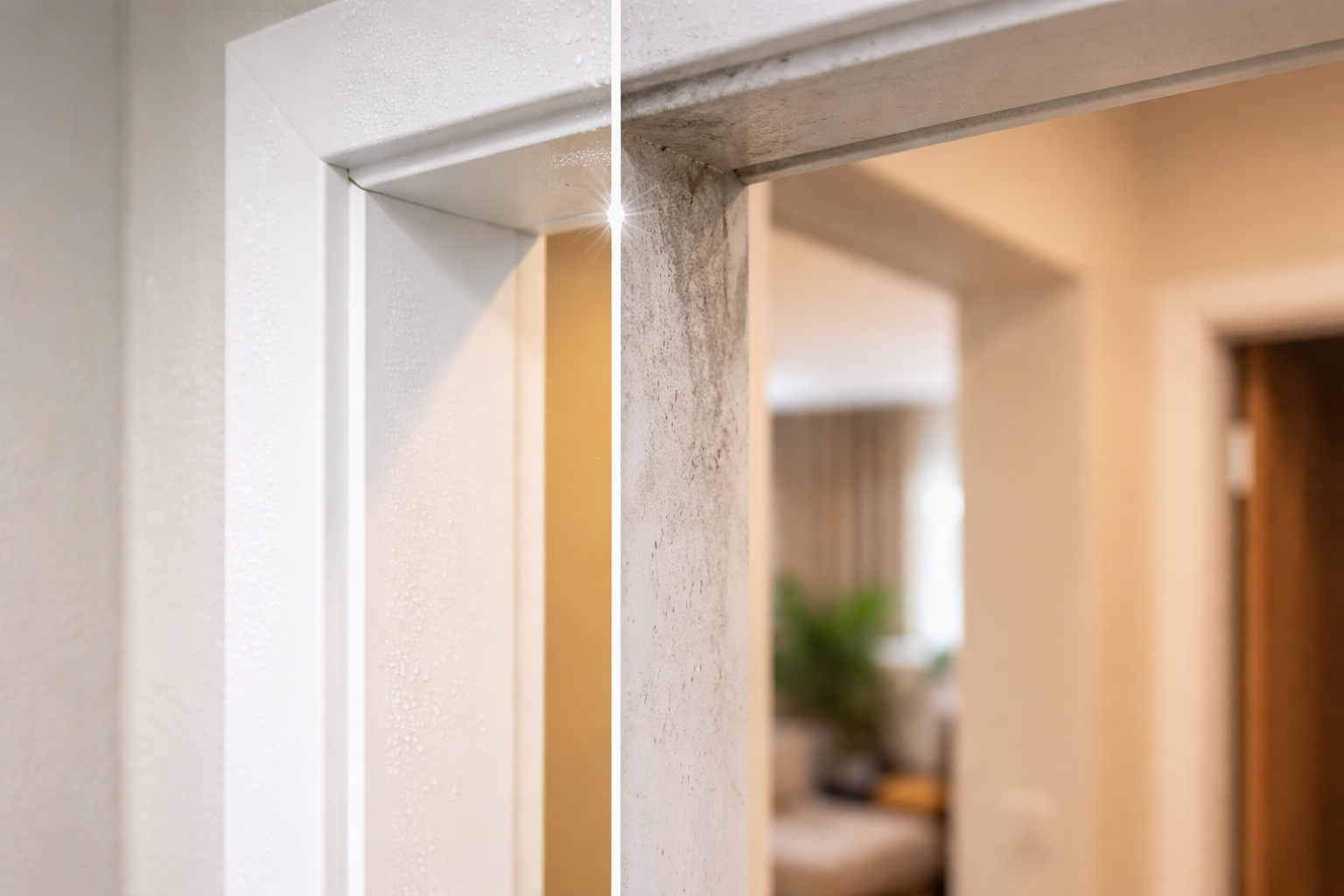 Uno strato poco appariscente di patina grigia sulle finiture delle porte rovina l’atmosfera generale degli interni e crea un senso di trasandatezza. Puliamo regolarmente i pavimenti e i frontali degli armadi, ma ci dimentichiamo completamente dei piani verticali che incorniciano l’ingresso alle stanze. In queste aree si accumulano polvere finerisolvere allergeni e peli di animali domestici.