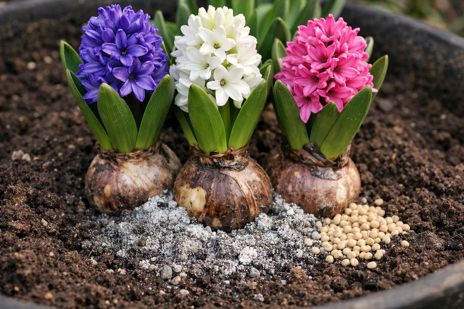 Non tagliate mai le foglie verdi dei giacinti dopo una cattiva stagione, perché è attraverso questa parte fuori terra che il bulbo immagazzina il nutrimento per la formazione del bocciolo dell’anno successivo.