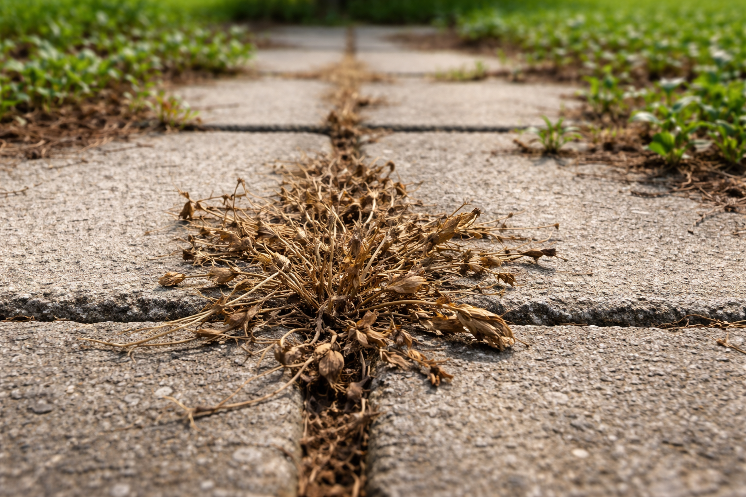Il modo più rapido per eliminare la crescita eccessiva tra le piastrelle o sui sentieri del giardino è utilizzare un acido concentrato di origine naturale. Il comune aceto da tavola distrugge le membrane cellulari dei germogli indesiderati, facendoli rapidamente rimpicciolire.