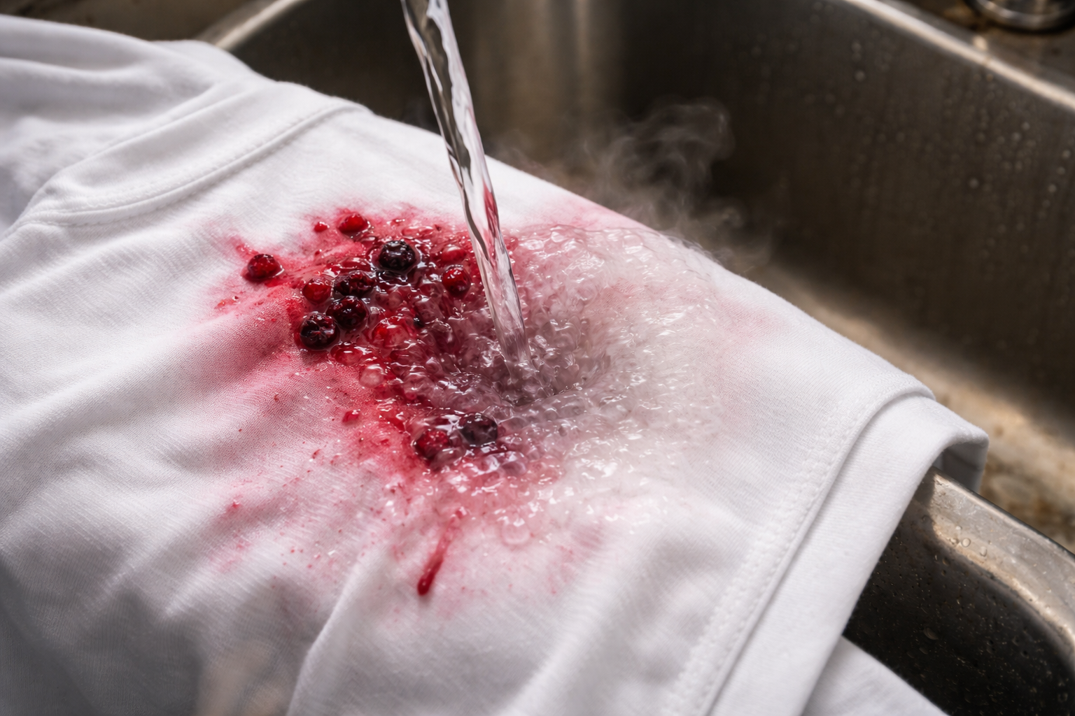 Lo strumento più efficace per affrontare lo sporco fresco è sempre a portata di mano. È un comune acqua bollente. L’alta temperatura rompe istantaneamente i coloranti organici, impedendo loro di fissarsi nelle fibre.