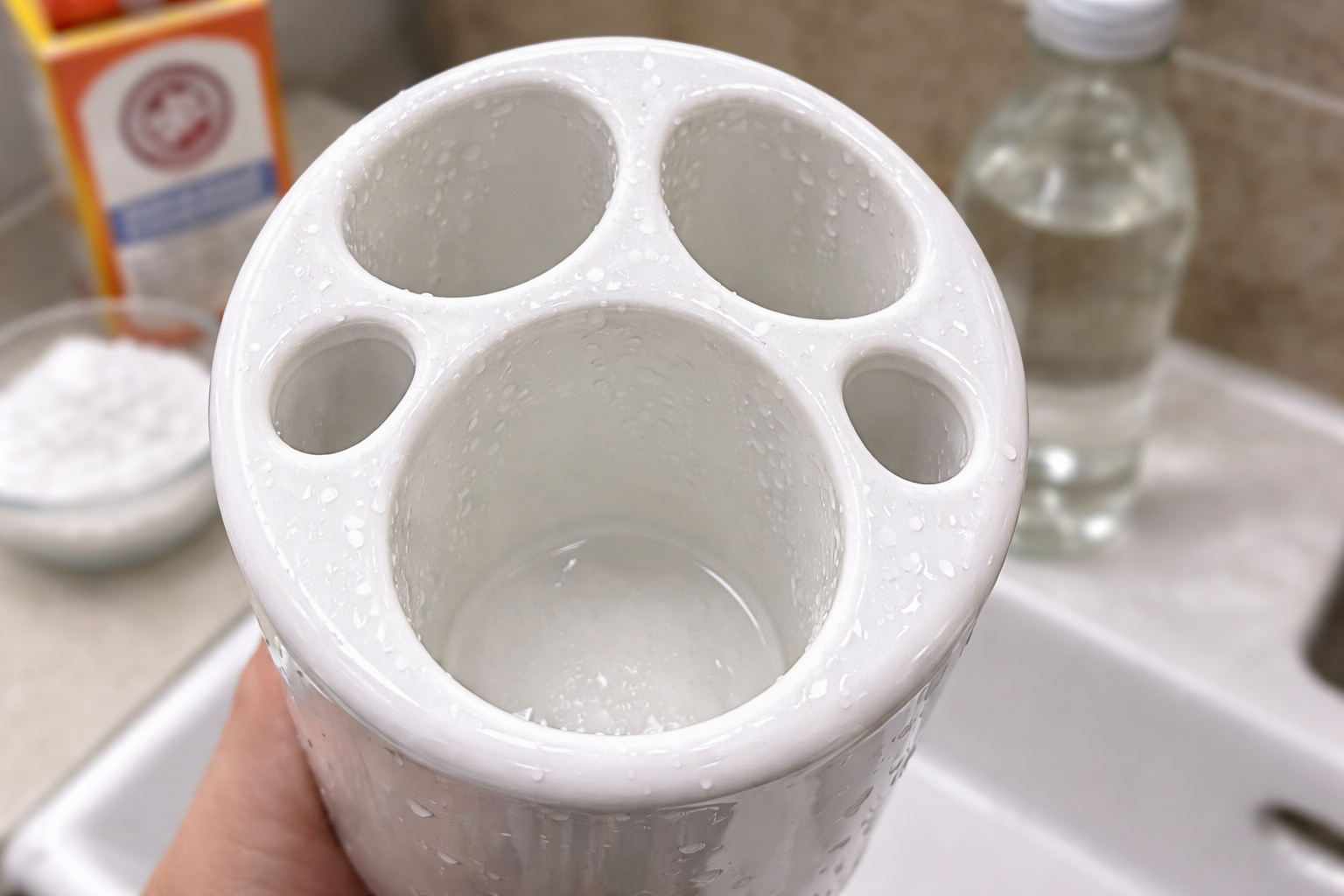 Spesso ignoriamo questo accessorio durante la pulizia, anche se è quello che entra in contatto con i nostri oggetti per l’igiene personale. Sul fondo si accumula una massa spessa che può essere problematica da pulire con la normale acqua. Ho provato molte opzioni e ho trovato il miglior equilibrio tra efficienza e sicurezza.